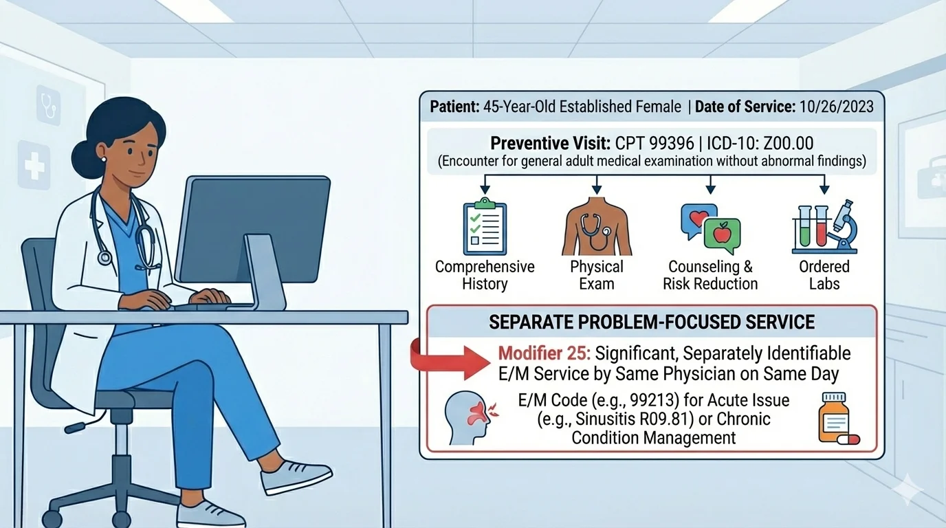 A 99396 visit must remain preventive in nature. If a provider addresses a separate medical problem during the same visit, that problem-focused service should be billed separately using the appropriate office visit code, with modifier 25 appended. Documentation must clearly distinguish preventive services from problem-focused evaluation and management.
